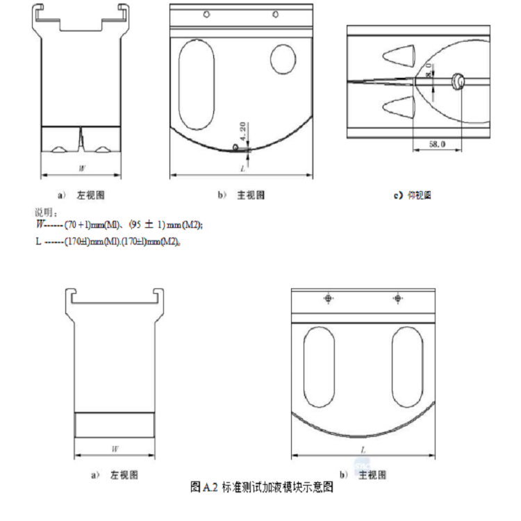 时单兀距离标准测试加液模块zui底部为4.2±0.2)mm,在模块的前段设罟:有一个弧形内凹的吸收区 域,在吸收区域内的下部有一个出液口,出液口距离标准测试加液模块弧形zui底部的直线距离为58.0 ±0.5)mm,在测试加液模块的底部中间有一个宽度渐变的沟槽,沟槽zui大宽度尺寸为8.0±0.2)mm, 同时与吸收区域连通,在沟槽的两侧有凸起结构。